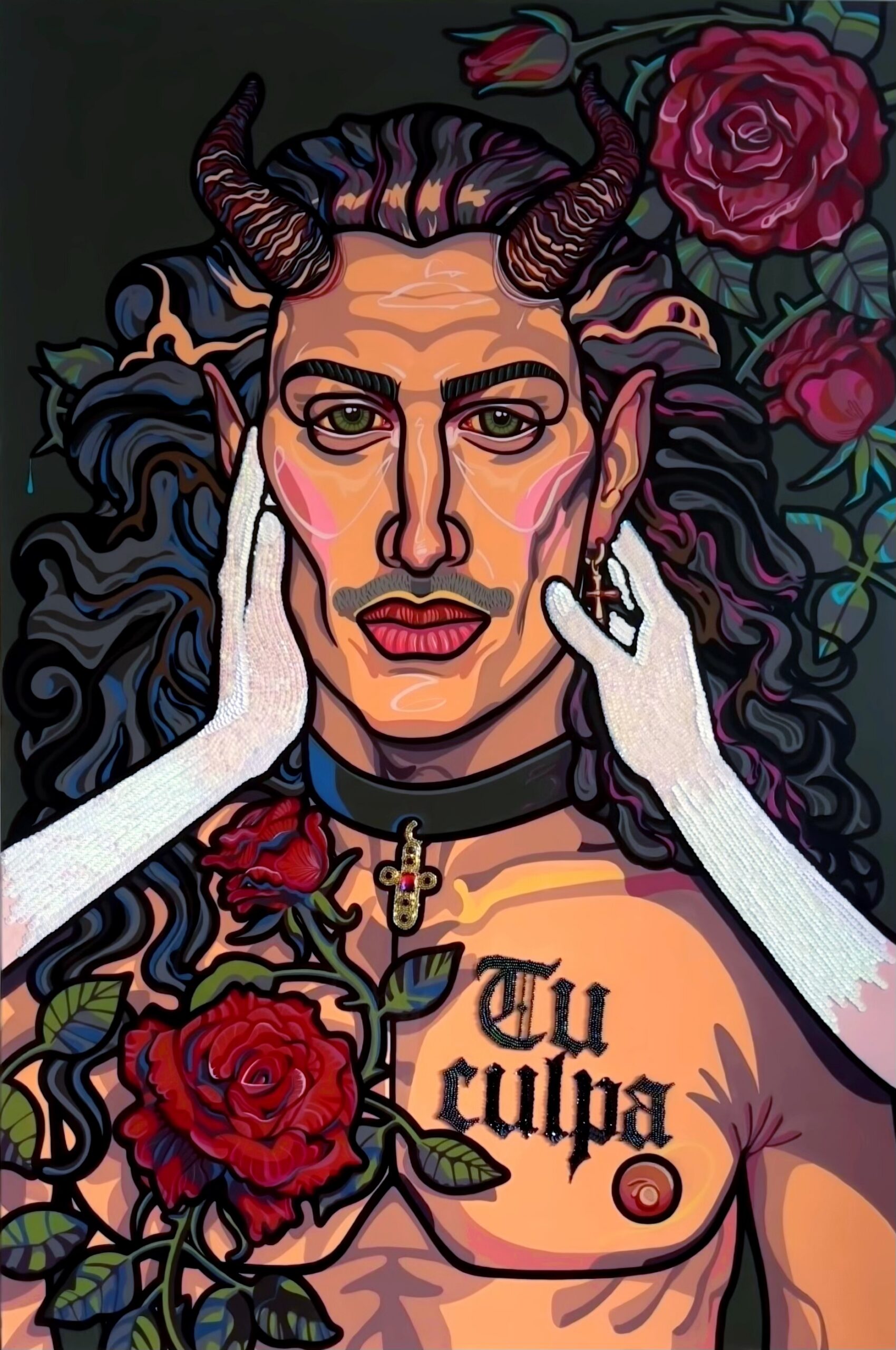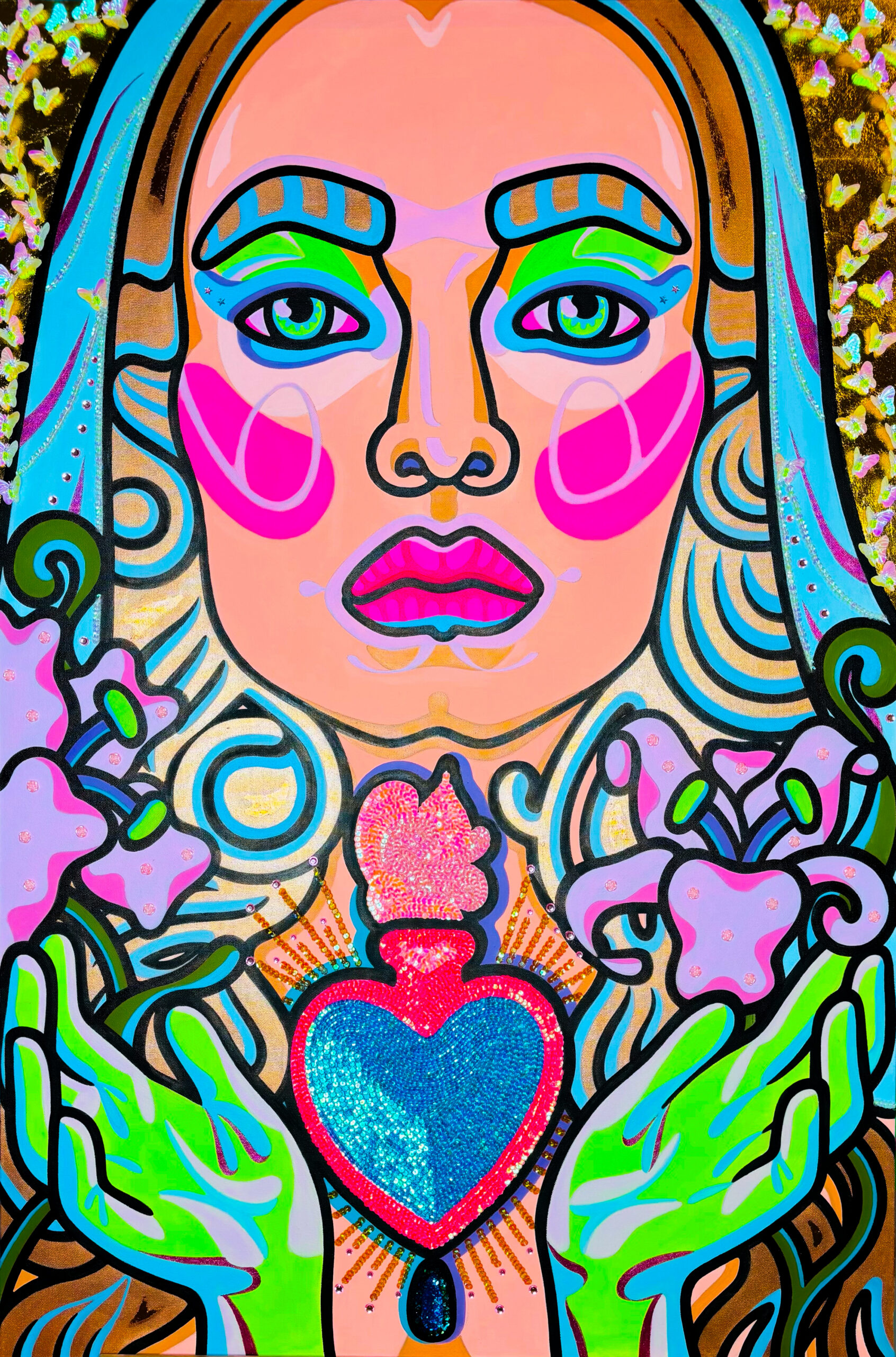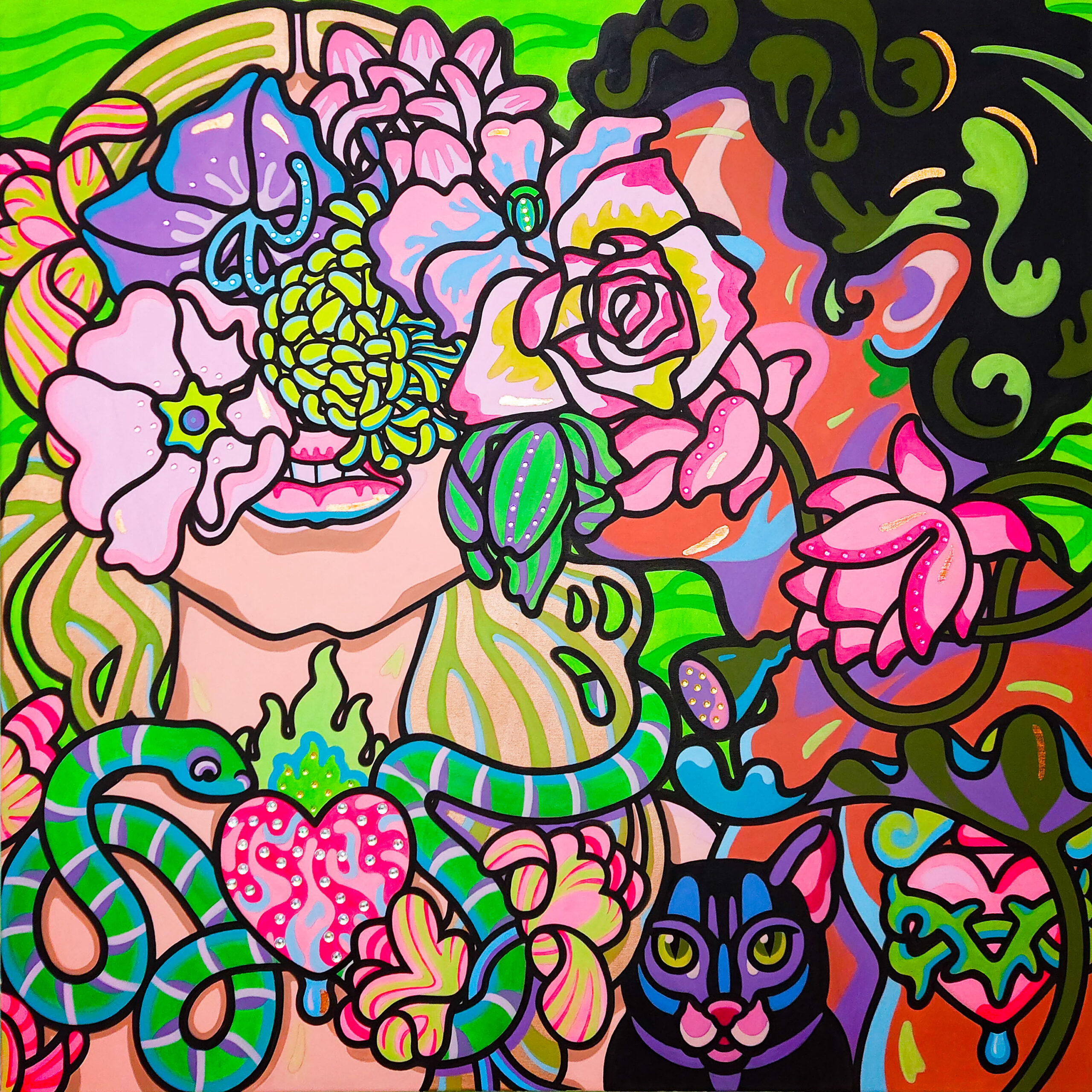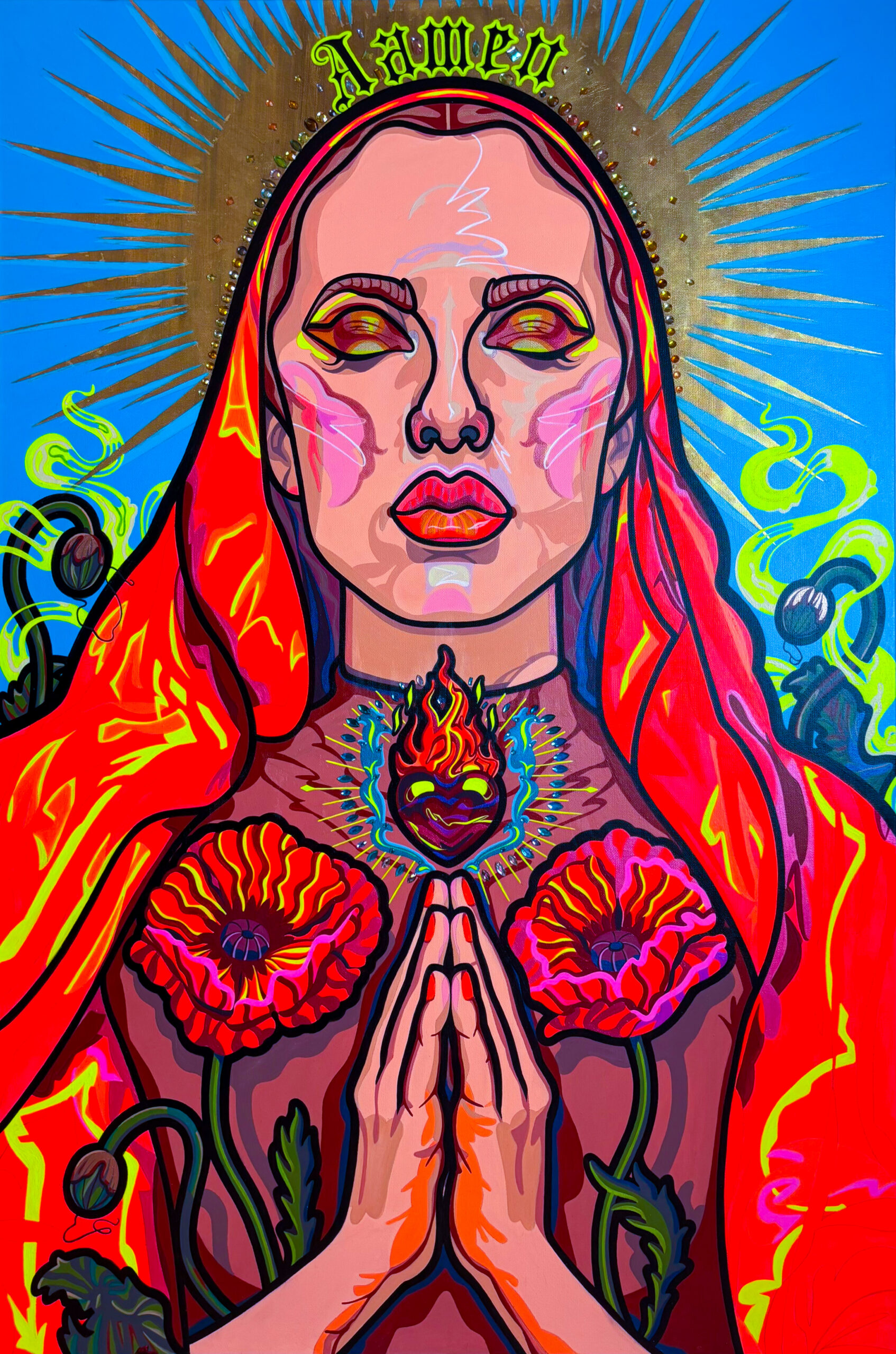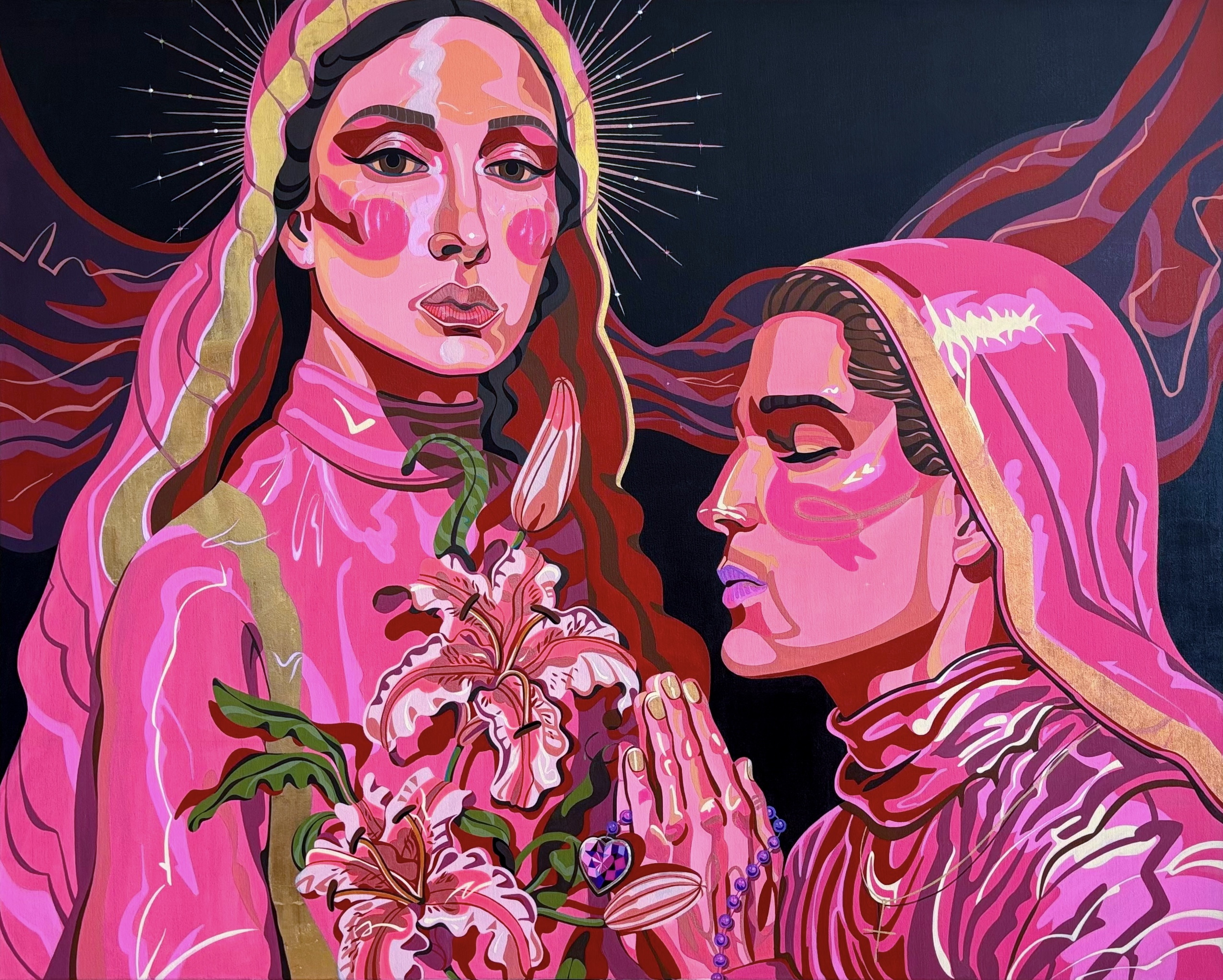 Burning hearts, halos, serpents, thorns and flowers — Ksenia Sulaeva paints emotional mythologies through a symbolic, feminine language.